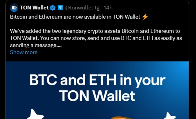 BTC 和 ETH 现在是可在 TON 钱包中使用。