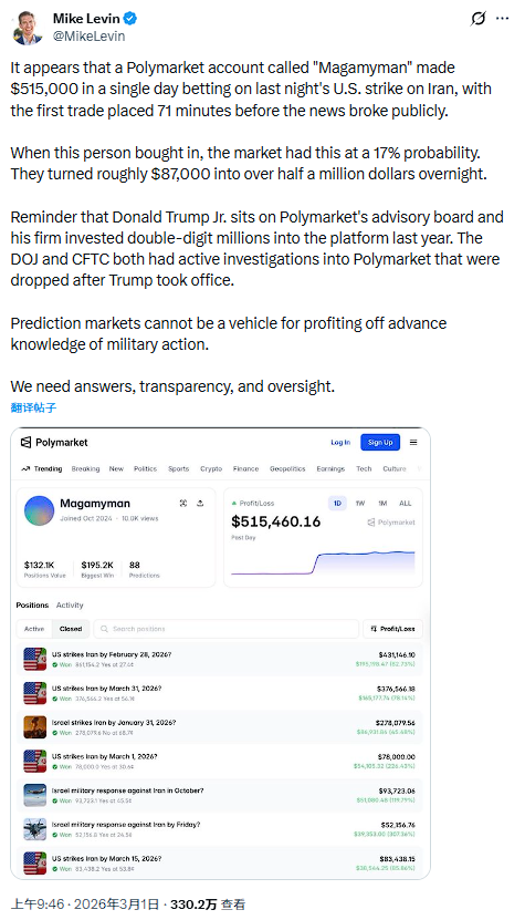 另据MikeLevin在社交平台X上发文披露,上述六个账户中,一个名为”Magamyman”的Polymarket账户单日获利51.5万美元,其首笔交易发生在相关新闻公开披露前71分钟。