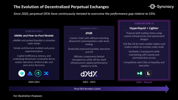 去中心化交易所(DEX)的理念已存在十余年,其愿景是提供自我托管、实时可审计、无许可构建和全球可访问的交易场所。然而,这些特性中的许多都伴随着严重的性能妥协。早期的永续合约 DEX 饱受吞吐量有限、高延迟和风险引擎粗糙的困扰,使其无法与成熟的中心化交易所竞争。