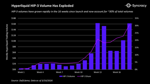 2025 年 11 月,Hyperliquid 通过推出 HIP-3 提案,迈出了超越加密永续合约的决定性一步,将其自身从仅限加密货币的交易所重塑为通用永续合约平台。HIP-3 允许第三方部署者在 Hyperliquid 的订单簿上创建新的永续合约市场,前提是满足最低技术要求并质押 50 万枚 HYPE 作为保证金。