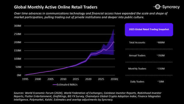 正如越来越多的市场参与者和社会评论家所观察到的那样,世界似乎正处于一个由零售驱动的投机超级周期之中。虽然对于这种行为的驱动因素存在争议——无论是生活成本上升和社会流动性缺乏促使人们投机,还是仅仅因为手机和放松管制使投机变得更加便捷——但趋势是明确的。全世界每天都有越来越多的人成为交易者。随着发展中地区中产阶级人口的壮大、围绕交易建立的互联网社区的成长,以及全球仍有超过 40 亿人「未享受经纪服务」,我们相信这一趋势还有很大的加速空间。