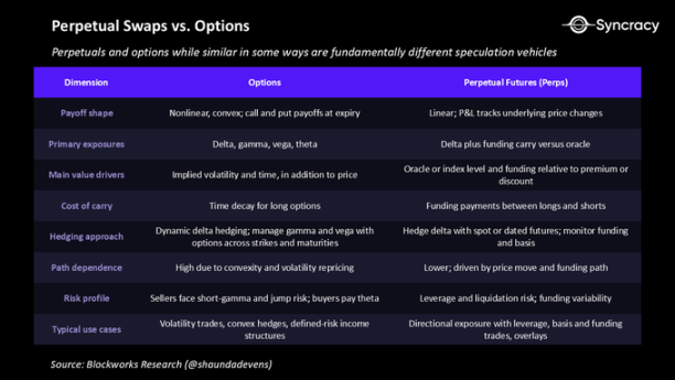 尽管永续合约不能完全替代期权,但我们确信它们能更好地满足零售交易者的投机需求,且不增加不必要的复杂性。期权在表达波动率观点、管理尾部风险和构建结构性敞口方面仍将发挥关键作用。它们由凸性驱动的回报以及到期前无清算风险的特点依然具有吸引力。但这些用例处于大多数零售交易活动的边缘地带。