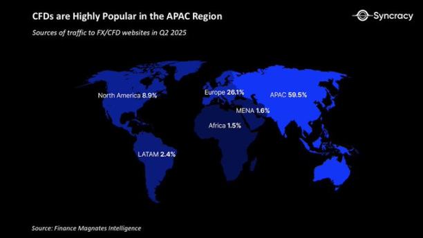 期权交易在美国零售交易者中呈现爆炸性增长,而在亚洲,零售交易者则日益倾向于差价合约。2025 年,全球外汇 / 差价合约行业的月均交易量超过 30 万亿美元,远高于十年前的不足 10 万亿美元。值得注意的是,约 60% 的差价合约网站流量来自亚太地区,而北美仅占约 9%。