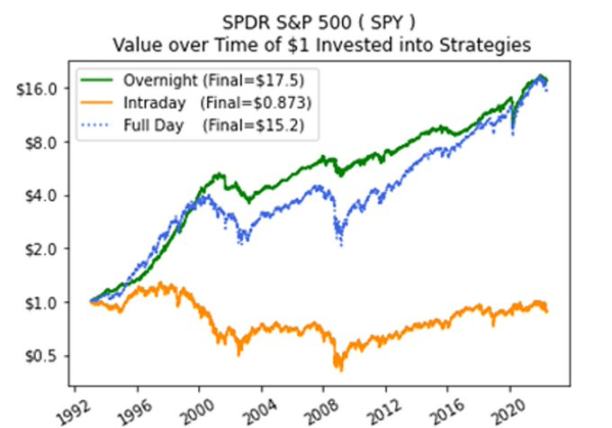 在股票领域,研究人员已经证实,有限的交易时间可能对零售交易者构成结构性劣势,这在很大程度上归因于一种被称为「隔夜漂移」的现象。数据表明,美国股票的长期回报中有不成比例的份额产生于常规交易时间之外,隔夜价格变动占据了已实现表现的很大一部分。