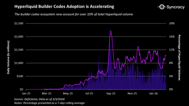 从构建者的角度来看,随着开发者生态系统的发展,去中心化交易所受益于一个良性的效用与分发循环。Hyperliquid 再次以其构建者代码和 HIP-3 市场提供了一个很好的例子。