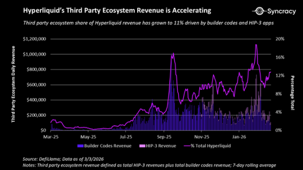 当与构建者代码结合时,这些机制允许部署者启动构建在 Hyperliquid 之上的完整交易所。如今,整个 Hyperliquid 第三方生态系统产生了 9000 万美元的年化收入。竞争对手现在被迫问自己一个关键问题:是与 Hyperliquid 竞争更好,还是干脆与之合作?
