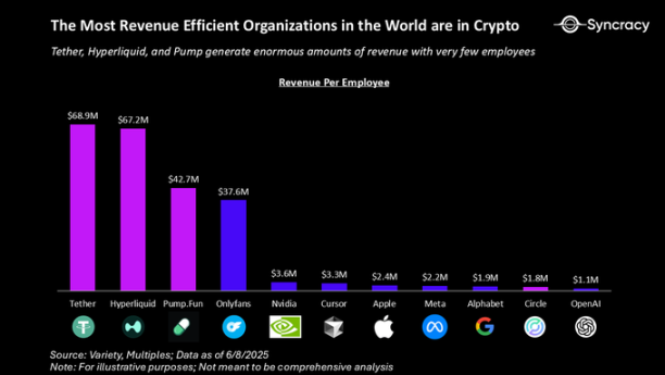 在我们最初的 Hyperliquid 报告中,我们将 Hyperliquid 描述为「世界上最高效的现金流机器之一」。如今,它以 10 亿美元的年化收入运行,拥有 99% 的净利润率,且仅有 12 名员工。这些指标不仅在标普 500 或纳斯达克的所有公司中无与伦比,而且以每位员工 8300 万美元的收入计算,它是全球收入效率最高的组织之一。
