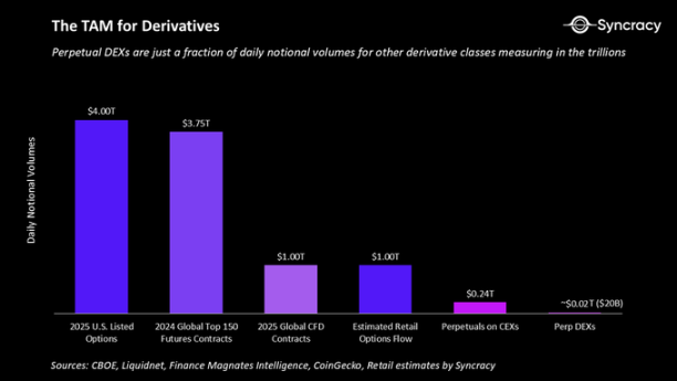 如今,考虑到 CEX 的规模,DEX 仅占加密永续合约总交易量的一小部分。与更广泛的全球衍生品市场相比,它们基本上微不足道。期权、期货和差价合约市场每天产生超过 8 万亿美元的名义交易量,而永续合约 DEX 仅有 200 亿美元。