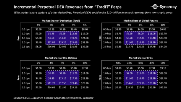 即使只是适度的市场份额捕获,其收入影响也是巨大的。上表说明了在全球衍生品市场中,在一系列可能的费率水平和市场渗透率下的年费机会。以 1 至 2 个基点的实际费率计算,仅捕获衍生品交易量的 1% 就相当于约 30 至 70 亿美元的年收入。达到 2% 至 4% 的份额,这个机会可以迅速增长到数百亿。请记住,如上所述,永续合约 DEX 拥有令人难以置信的利润率,因此你可以将这些收入或多或少地视为利润。