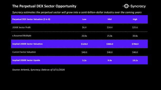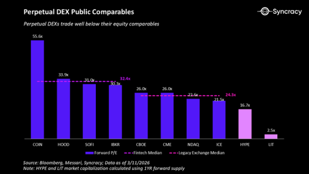 我们相信市场尚未认识到这种潜力或永续合约 DEX 的长期竞争力。市场领导者 Hyperliquid 和 Lighter 的市盈率分别仅为 17 倍和 3 倍,远低于其金融科技和传统交易所同行。下面我们使用上述同行倍数和我们对 2030 年行业利润的估计(基于以上分析得出)来量化这个机会。